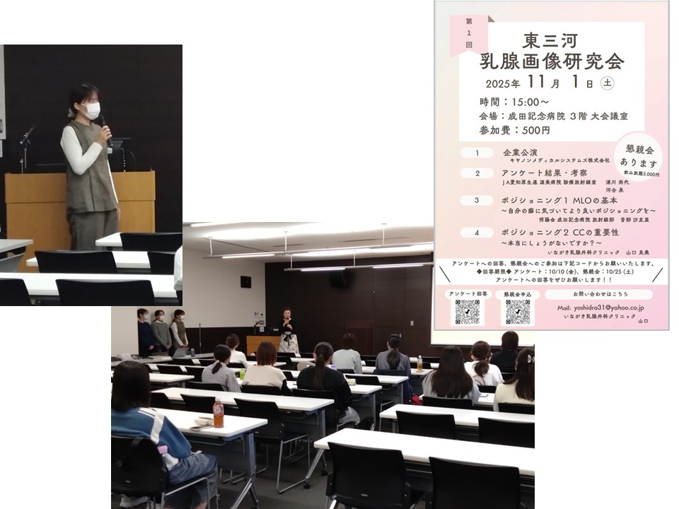 11月1日(土)に、当院におきまして「第1回 東三河乳腺画像研究会」を無事に開催いたしました。新型コロナウイルスの感染拡大以降、集合型の研究会を実施することが難しくなり、東三河地域では長期間にわたり活動が停止しておりましたが、事前アンケートにより多くの施設で勉強会が実施できていない状況が判明したため、この状況を打破すべく、役員の一人として本研究会を立ち上げました。この研究会は、東三河全体でマンモグラフィの技術力と基礎力のレベルアップ、そして情報共有を推進することを主な目的としています。当日は近隣の病院から20名を超える診療放射線技師の皆様にご参加いただき、私自身も発表をさせていただきました。参加者の方々からは、「自施設ではなかなか勉強会が開催できなかったので、このような会があると大変嬉しい」といったお声をいただき、本研究会の持つ意義と皆様の熱意を強く感じました。今後も、参加者が気軽に参加でき、技術や知識、読影能力の向上に少しでも繋がるよう、内容を工夫しながら継続的に企画・検討を進めてまいります。