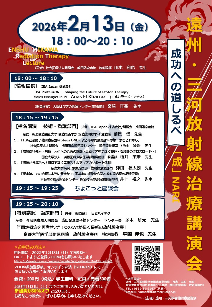 2026遠州・三河放射線治療講演会~成功への道しるべ「成」NARI~(WEB)を下記日程にて開催いたします。本会は、参加者のみなさまへ放射線治療分野における情報提供と医療貢献に寄与することを目的として企画しました。つきましては、ご多用中とは存じますが、是非ともご参加を賜りますようお願い申し上げます。